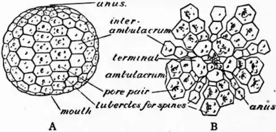 Bothriocidaris globulus. from the Encyclopædia Britannica, 1911. The short spines which were attached to the tubercles are not drawn.