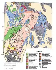 The Butte Granite makes up the bulk of the batholith (about 70%), with additional named intrusions along the periphery consisting of granodiorite, monzogranite, and minor syenogranite. The batholith intruded into Mesoproterozoic and Mesozoic sedimentary rocks, including the Elkhorn Mountains volcanics. The origin of these igneous rocks is related to subduction and continental magmatic arc processes associated with the Late Cretaceous western margin of North America. Later hydrothermal vein activity along fault and shear zones within the Butte quartz monzonite and its contact with adjacent rocks, resulted in major ore deposits of lead, zinc, and silver.[2][3]
