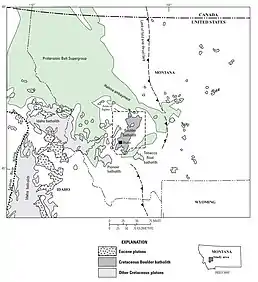 The Boulder Batholith is a relatively small batholith in southwestern Montana, United States, exposed at the surface as granite (more specifically quartz monzonite) and serving as the host rock for rich mineralized deposits at Butte and other locations. The batholith lies roughly between Butte and Helena, and between the Deer Lodge (Upper Clark Fork) Valley and the Broadwater (Upper Missouri) Valley. The volcanic Elkhorn Mountains are a large mass of forested lava associated with the batholith.