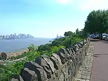 Old Glory Park is near the town line of West New York where of the much boulevard is abutted by parks and scenic overlooks. A statue of Thomas M. Donnelly, instrumental in the preservation of the Palisades, is located in the park named for him. The trap rock walls that line much of the overlook come from quarry operations that he and the NJ Federation of Women's Clubs were able curtail at the beginning of the 20th century.[21] 60th Street, the main crosstown street for the town became Hillside Road (officially renamed for Anthony DeFino, who was mayor for 24 years[22]) connecting the boulevard to River Road. One of the few residential neighborhoods on the cliff side of the boulevard is found north of the major crossroad at one of its more severe curves. It is here that the road reaches a height of nearly 260 feet near the highest point in Hudson County.[23] The park on 60th Street features a fountain erected in tribute to the victims of the September 11 Attacks.[24]