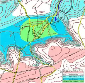 The main portion of the village is formed on the unique 'Bowerchalke greensand inlier' (an area of older rock completely surrounded by younger layers), highlighted in green on the adjacent map. It is not immediately obvious to the naked eye or on the standard Ordnance Survey maps with 10 metre contours[16] but the apex is strikingly characterised by the 'island' drawn on the Andrews 1773 map. Its presence can be detected in the friable sandy soils in the centre of the village.