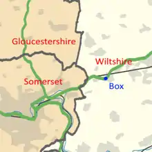 Box lies in Wiltshire, close to the border with Somerset (roughly 1.0 mile (1.6 km) away as the crow flies) and Gloucestershire (about 1.9 miles (3.1 km) away). The place where the three counties meet is marked by the Three Shire Stones.