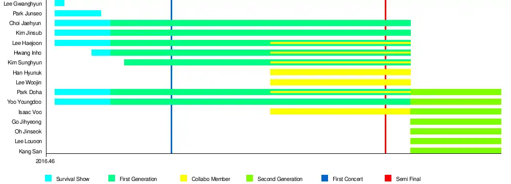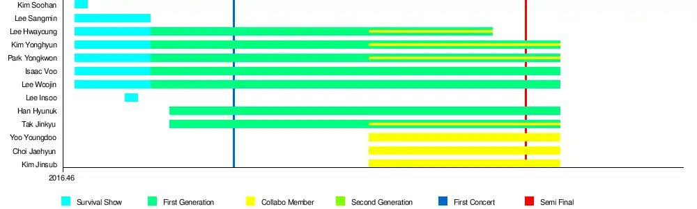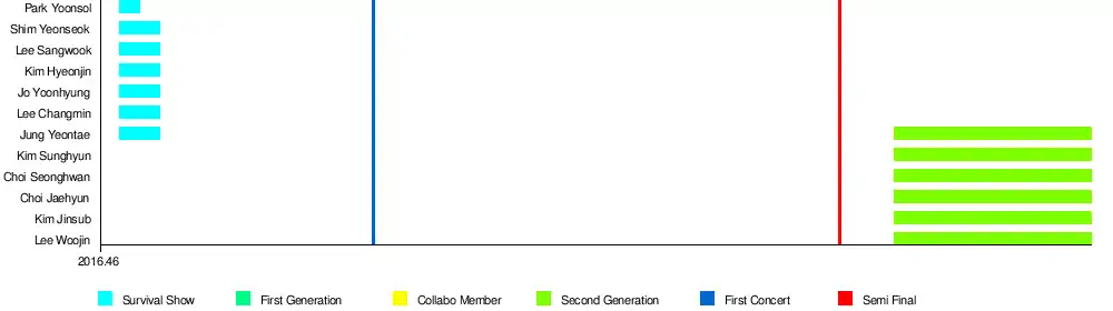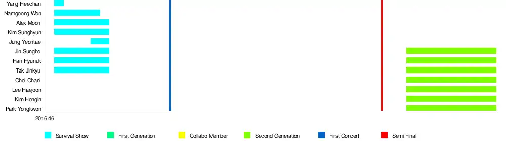 After completing 260 concerts,[3] the final group was selected from "The Final", consist of eight members: Yoo Youngdoo (Yoo Jiahn), Jeong Yeontae, Hwang Inho, Han Hyunuk, Isaac Voo, Lee Inpyo, Kim Jinsub and Kim Sunghyun. They debuted on October 26, 2017 as IN2IT.[12]