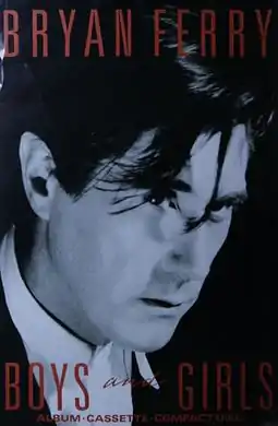 Boys and Girls is the sixth solo studio album by the English singer and songwriter Bryan Ferry, released in June 1985 by E.G. Records. The album was Ferry's first solo album in seven years and the first since he had disbanded his group Roxy Music in 1983. The album was Ferry's first and only number one solo album in the UK.[2] It was certified Platinum by the British Phonographic Industry and contains two UK top 40 hit singles. It is also Ferry's most successful solo album in the US, having been certified Gold for sales in excess of half a million copies there.
