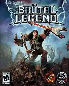 Part of the game's inspiration came from the fantasy worlds that the lyrics and album covers of metal bands implied but rarely made it to music videos, thus allowing Brütal Legend to "fulfill the promise" of such lore.[18] Schafer also credits a Megadeth roadie named Tony he once met as having given him the idea to make a game about a roadie, with the character of Eddie Riggs becoming a re-imagined version of him.[20] Schafer had previously explored the idea of a roadie sent back in time with the character of Hoagie from Day of the Tentacle, but Brütal Legend represented an opportunity to expand on it further.[21] The 2003 movie School of Rock also reminded Schafer of his idea for Brütal Legend, and made him more excited to publish it.[22] Double Fine's philosophy on game development was also another reason for Brütal Legend's creation, as Schafer has stated that his team attempts to make each game radically different from the company's previous release, contrasting Brütal Legend to Psychonauts.[23] Schafer stated that the commercial tie-ins of Brütal Legend, such as "hot babes and Jack Black", is due to this philosophy and not due to market pressures. Schafer was not concerned about the commercial success of Brütal Legend, as despite poor sales of Psychonauts, "as long as you make a cool game, publishers want to talk to you".[23] When Schafer was pitching the game before 2006, he received feedback about changing the game's style to hip hop or country. He credits Harmonix Music Systems for influencing the rhythm game market through the release of the widely successful Guitar Hero with a soundtrack that heavily emphasized metal music; with the popularity of Guitar Hero, the metal approach in Brütal Legend was readily accepted.[18]