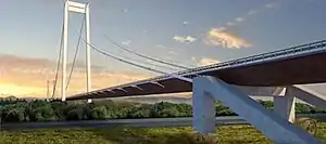 The project consists of the construction of a suspension bridge of 1,974.30 m (6,477.4 ft) length (with a 1,120 m (3,670 ft) main span, and two side spans of 489.65 m (1,606.5 ft) long on the Brăila bank of the river and 364.65 m (1,196.4 ft) long on the Tulcea bank of the river), two access viaducts of 110 m (360 ft) length on both sides (which will add to the length of the suspended bridge), and a connecting road with a total length of approximately 23 km (14 mi).[1] The entire project is being built by the Astaldi and IHI Infrastructure Systems association, at an estimated cost of € 433 million.[2][3]