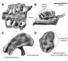The holotype skeleton consists of the right humerus (upper arm bone), the right femur (thigh bone), the right ilium (a hip bone), the right coracoid (a shoulder bone), the sacrum (fused vertebrae of the hip), the last seven thoracic (trunk) and two caudal (tail) vertebrae, and several ribs.[1][4][15] Riggs described the coracoid as from the left side of the body,[1][11][15] but restudy has shown it to be a right coracoid.[4] At the time of discovery, the lower end of the humerus, the underside of the sacrum, the ilium and the preserved caudal vertebrae were exposed to the air and thus partly damaged by weathering. The vertebrae were only slightly shifted out of their original anatomical position; they were found with their top sides directed downward. The ribs, humerus, and coracoid, however, were displaced to the left side of the vertebral column, indicating transportation by a water current. This is further evidenced by an isolated ilium of Diplodocus that apparently had drifted against the vertebral column, as well as by a change in composition of the surrounding rocks. While the specimen itself was embedded in fine-grained clay, indicating low-energy conditions at the time of deposition, it was cut off at the seventh vertebra by a thick layer of much coarser sediments consisting of pebbles at its base and sandstone further up, indicating deposition under stronger currents. Based on this evidence, Riggs in 1904 suggested that the missing front part of the skeleton was washed away by a water current, while the hind part was already covered by sediment and thus got preserved.[11]