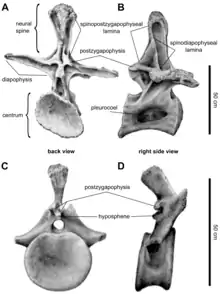 Though the vertebral column of the trunk or torso is incompletely known, the back of Brachiosaurus most likely comprised twelve dorsal vertebrae; this can be inferred from the complete dorsal vertebral column preserved in an unnamed brachiosaurid specimen, BMNH R5937.[64] Vertebrae of the front part of the dorsal column were slightly taller but much longer than those of the back part. This is in contrast to Giraffatitan, where the vertebrae at the front part were much taller but only slightly longer. The centra (vertebral bodies), the lower part of the vertebrae, were more elongated and roughly circular in cross-section, while those of Giraffatitan were broader than tall. The foramina (small openings) on the sides of the centra, which allowed for the intrusion of air sacs, were larger than in Giraffatitan. The diapophyses (large projections extending sideways from the neural arch of the vertebrae) were horizontal, while those of Giraffatitan were inclined upward. At their ends, these projections articulated with the ribs; the articular surface was not distinctly triangular as in Giraffatitan. In side view, the upward-projecting neural spines stood vertically and were twice as wide at the base than at the top; those of Giraffatitan tilted backward and did not broaden at their base. When seen in front or back view, the neural spines widened toward their tops.[4]