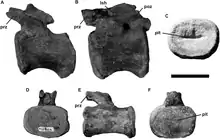 Air sacs not only invaded the vertebrae, but also the ribs. In Brachiosaurus, the air sacs invaded through a small opening on the front side of the rib shafts, while in Giraffatitan openings were present on both the front and back sides of the tuberculum, a bony projection articulating with the diapophyses of the vertebrae. Paul, in 1988, stated that the ribs of Brachiosaurus were longer than in Giraffatitan, which was questioned by Taylor in 2009.[4] Behind the dorsal vertebral column, the sacrum consisted of five co-ossified sacral vertebrae.[11] As in Giraffatitan, the sacrum was proportionally broad and featured very short neural spines. Poor preservation of the sacral material in Giraffatitan precludes detailed comparisons between both genera. Of the tail, only the second caudal vertebra is well preserved.[4]