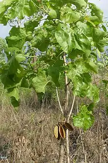 Brachychiton megaphyllus grows as a large shrub or small tree, ranging from 2–8 metres (6 ft 7 in–26 ft 3 in) tall, with a trunk that can be 10 to 25 centimetres (3.9 to 9.8 in) wide at breast height. The dark brown bark has vertical furrows and shallow tessellations. Like those of all members of the genus, the leaves are alternately arranged along the stems. The large leaves are roughly oval or three-lobed in shape, measuring 15–26 centimetres (5.9–10.2 in) long by 13–24 centimetres (5.1–9.4 in) wide. The leaf base is cordate (heart-shaped). The plant is deciduous, bare of leaves from June to September. The orange-red flowers appear from June to October or sometimes November. The yellow-brown woody follicles, or seedpods, mature from September to June. Measuring 6.5–11 centimetres (2.6–4.3 in) long and 3–4.8 centimetres (1.2–1.9 in) wide, they split along their length to reveal 25–45 seeds. The seeds, which are ovoid with a smooth surface, and 8–9 millimetres (0.31–0.35 in) long by 6–7 millimetres (0.24–0.28 in) wide, are covered by a hairy coating known as the exotesta.[3]