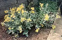 These hybrids are hardy where it is warm and dry, they do well in coastal areas similar to where their parents live[7] and mature into sprawling bushes of highly attractive foliage[2] usually wider than high. Greyish foliage, the undersides of the leaves and stems are covered in white down and spectacular when in bloom with branching heads of brilliant yellow daisy-flowers.[7]