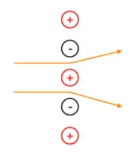 The concept behind the Bradbury–Nielsen shutter is to apply a high frequency voltage in a 180° out-of-phase manner to alternate wires in a grid which is orthogonal to the path of the ion beam. This results in charged particles only passing directly through the shutter at certain times in the voltage phase (φ=nπ/2), when the potential difference between the grid wires is zero. At other times the ion beam is deflected to some angle by the potential difference between the neighboring wires. This deflection is divergent with ions that pass through alternate slits being deflected in opposite directions. The maximum deflection angle [4] can be calculated by