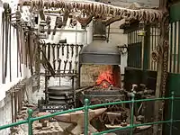 The Horse Emporium was once the mill's canteen block. The displays are arranged on the theme of horse power.[4] Among other exhibits there is a heavy-duty British Railways dray, a decorative chaff cutter and a horse fodder measure. There is a saddler-at-work display, plus horse brasses, horseshoes and other harness.[19] In a stable there is a blacksmith's workshop and farriery display, complete with many horseshoes, anvils, and metalworking tools.[4]