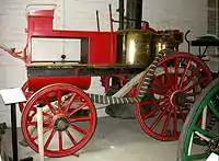 This building was a 1918 motor car garage. The museum kept dray horses in the stables until 2011. At one end it contains restored horse-drawn vehicles. There is a reproduction of an 1890 garden seat omnibus, with wooden, slatted seats on top, like garden seats. These vehicles have not been used in the UK since 1931. This reproduction has hydraulic disc brakes for safety. There is a brougham, a 19th-century gentleman's light one-horse carriage. This design is said to have been named after Lord Chancellor Brougham in the early 19th century. There is also a steamer, or Shand Mason steam fire pump of ca.1880. A team of horses pulled it, and steam powered it, at 250 gallons per minute. Firemen could get it ready in 7 minutes. It was successful enough for the manufacturers to export it worldwide - for example to the Warsaw Fire Guard - but it was expensive in coal and horses, and was superseded by motor pumps in ca.1900.[20]