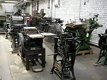There is a display of lead glyphs for typesetting. These would be set into a forme so that the text read backwards and upside down, then inked and pressed against paper using a platen in a printing press. The display includes various kinds of printing presses, including a Wharfedale stop cylinder press.[6]