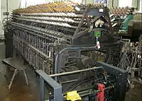 Examples of flyers include a 120-spindle flyer spinner and a 122-spindle flyer twister. The flyer is the original type of mechanical spinning frame and is believed to be a direct development of the Saxony wheel used in hand spinning. It is suitable for producing thick smooth yarns from coarse quality wools and hairs, but is falling into disuse because of the low speed at which the spindles have to run. On the flyer spinner as the yarn leaves the front rollers it is guided through a porcelain ring to the top of a revolving spindle, around and down one of the arms of the flyer and onto the bobbin. The bobbin is carried on a lifter plate and moves up and down the spindle. As the flyer revolves, imparting twist to the yarn, the bobbin which is free to rotate on the spindle is pulled round by the spun yarn. A felt or cloth washer is placed between the lifter plate and bobbin to retard the revolving bobbin and create adequate yarn tension for the flyer to wind the yarn evenly on the bobbin. When the bobbins are full they are removed and replaced by empty ones. This action is termed doffing and is done manually.[6] Twisting is the process in which two or more single-spun yarns are united to produce a yarn of greater strength for use as warp threads in the weaving process and for normal knitting purposes. This is done by rollers delivering the yarns to a revolving spindle which twists or folds the single yarns around one another. The machines used are similar to spinning frames in their method of applying twist, but differ in that they have only one set of delivery rollers instead of the usual complement of drafting rollers. This machine is an early example of a flyer twisting frame. On the flyer twister, twist imparted to the yarn in a similar manner as on the flyer spinner. A weighted band, running in a groove at the base of the bobbin, retards the revolving bobbin creating enough tension for the flyer to wind the yarn evenly onto the bobbin. The machine is hand doffed.[6]