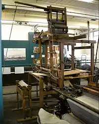 The hand loom with jacquard is a wooden hand loom typical of the many thousands of looms that were used in the domestic cottage industry throughout the British Isles. They were gradually replaced by all-metal looms (see the Hattersley domestic loom) and new methods of working practice, such as the factory system, during the Industrial Revolution. The loom has a four-shuttle drop box to weave up to four colours of weft, and has John Kay's flying shuttle method of inserting the weft. Most of the handlooms used in the home were ordinary shaft looms. These do not require roof space and would be weaving standard cloths, unlike this loom which is fitted with a 360 hook de Vogue jacquard and can weave very complex fabrics.[6]