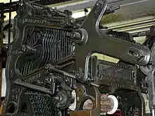 This gallery holds machinery from the last of the hot metal typesetting printshops as used in the newspaper industry. The monotype keyboard produces punched 31-level tape for casting on the monotype caster. The keyboard comprises seven QWERTY arrangements (Roman upper and lower case, bold upper and lower case, italic upper and lower case and small capitals). It is operated by compressed air and produces a wide paper tape that contains perforations that when transferred to the caster give full instructions for each character to be cast. The monotype system was widely used in the commercial printing sector.[6] There is a forme (text lines produced on a Linotype typesetting machine) made up into the front page of the last edition of the Yorkshire Sports, 2 May 1981. The assembled forme is ready to be moulded and cast into a curved printing plate.[6]