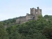 Brandenbourg Castle (French: Château de Brandenbourg), now a ruin, is located on a promontory some 70 metres above the village of Brandenbourg in north-eastern Luxembourg. It has a history going back to the 9th and 10th centuries when there was a wooden fort on the site. The 13th century keep, now 11.9 metres high, used to have four floors, only three of which remain. In 1668, the French attacked the castle which subsequently fell increasingly into ruin. It is now owned by the Luxembourg State.[1]