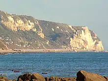 Branscombe's principal industries are farming and tourism, although a significant number of permanent residents are retired. In 2009 over half the estimated population were aged over 50. The village straggles along narrow roads down steep-sided valleys, terminating at a shingle beach, Branscombe Mouth, which forms part of the East Devon and Dorset Jurassic Coast. To either side of the beach, the coast rises steeply to cliffs, which are in the ownership of the National Trust. It is a popular point for starting walks on the South West Coast Path; it is a short walk eastwards to Beer (with two alternative routes, one at the top of the cliffs and the other ascending the cliffs via the interesting Hooken Landslip area also called the Undercliff) and a longer walk westwards towards Sidmouth.