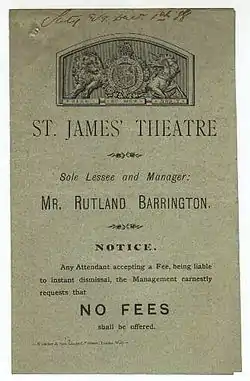 Brantinghame Hall is a play in four acts written by W. S. Gilbert for his friend Rutland Barrington, who was then leasing the St. James's Theatre. The play opened on 29 November 1888 and closed on 29 December, after about 27 performances.[1] It starred Barrington, his younger brother, Duncan Fleet, Lewis Waller, and Julia Neilson (being the professional stage debut of the latter two).[2] Its companion piece was A Patron Saint.[3]