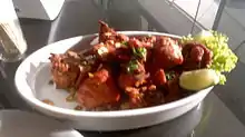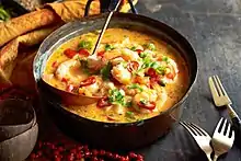 Some typical dishes are feijoada, considered the country's national dish,[6] and regional foods such as beiju, feijão tropeiro, vatapá, moqueca, polenta (from Italian cuisine) and acarajé (from African cuisine).[7] There is also caruru, which consists of okra, onion, dried shrimp, and toasted nuts (peanuts or cashews), cooked with palm oil until a spread-like consistency is reached; moqueca , consisting of slow-cooked fish in palm oil and coconut milk, tomatoes, bell peppers, onions and garlic, topped with cilantro;