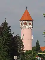 The Brežice Water Tower was built in 1914,[1][2] together with a city sewage system and electrification. It used to serve as the water supply for Brežice until the new water house was built below Šentvid Hill above the town. It is 46 meters (151 ft) high[2] and it is one of the most prominent buildings in town. Today the water tower houses a pub.