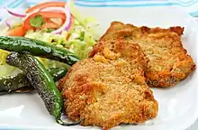 In Argentina, Uruguay, and Venezuela the milanesa, a dish similar to the schnitzel, is a typical dish.[2] Its name means 'from Milan'. The milanesa is made of beef or veal, dipped in egg, and then breadcrumbs, and fried. In Argentina, a milanesa napolitana is topped with ham, melted mozzarella cheese and tomato slices or tomato sauce.