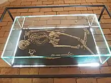 Since victims' bodies of the breaking wheel were often left exposed to environmental influences over a long period of time, hardly any archaeological features for the "breaking wheel" exist; as a deterrence, the bodies were often left on public display over many years, exposed to wind and weather, birds and other scavenging animals could also take away the remains and bones. In the German-speaking areas, only a few archaeological discoveries of breaking wheel victims have been documented so far.: In autumn 2013, the skeleton of a man was found in Groß Pankow, Germany, during the laying of Federal Highway 189 (Bundesstraße 189) between Perleberg and Pritzwalk in Brandenburg, whose position and signs of injury indicate death by the "breaking wheel".[23] Based on an iron belt buckle, the skeleton was dated to the 15th to 17th centuries. The identity of the man is unknown.[23] A similar archaeological find has since also been discovered in 2014, in Pöls-Oberkurzheim, Styria, Austria.