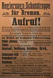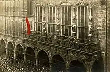 Before the creation of the Soviet state, radical labour movements already enjoyed significant support in Bremen (due to high employment levels in heavy industry) with the SPD electorally dominating the city (a trait seen to this day).[3] As a result, with the outbreak of the civil war, Bremen was strongly sympathetic to the left-leaning Spartacus League. The revolt in Bremen began just before the abdication of the Kaiser (6 November 1918) with a workers' council being established and elected. This council sat in Bremen City Hall and managed the affairs of the small state independent of the newly established, SPD-led, Weimar Republic in Berlin.[4]