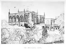 Hodgson resigned in 1844 when Lord Ellenborough posted Henry Montgomery Lawrence as Resident to Nepal and transferred Hodgson as Assistant Sub-commissioner to Simla. He then returned to England for a short period. During this time, Lord Ellenborough was himself dismissed. Hodgson visited his sister Fanny who had become Baroness Nahuys and was living in Holland.[9] In 1845 he settled in Darjeeling and continued his studies of the peoples of northern India for thirteen years. Joseph Dalton Hooker visited him during this period and wrote back to Charles Darwin with information obtained from Hodgson on the introduced species and hybrids.[10] Hodgson's son Henry was sent to tutor the son-in-law of Jung Bahadur Rana of Nepal. In 1857 he influenced Viscount Canning to accept Jung Bahadur Rana's help in 'suppressing' the Indian Rebellion of 1857. In the summer of 1858, he returned to England and would not visit India again.[11] He lived initially at Dursley in Gloucestershire but in 1867 moved to Alderley in the Cotswolds.[12]