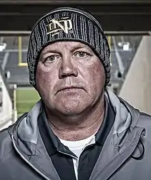 Brian Keith Kelly (born October 25, 1961) is an American football coach. He is currently the head football coach at the University of Notre Dame, a position he has held since December 2009. Kelly previously served as the head football coach at Grand Valley State University (1991–2003), Central Michigan University (2004–2006), and the University of Cincinnati (2006–2009). He led the Grand Valley State Lakers to consecutive NCAA Division II Football Championships in 2002 and 2003. Kelly's 2012 Notre Dame Fighting Irish football team reached the 2013 BCS National Championship Game.