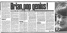 One of the earliest instances of Taylor announcing that Wilson was a genius was in his 1966 article titled "Brian Wilson: Whizzkid Behind the Beach Boys".[27] More references to the "genius" rhetoric appeared in Melody Maker and New Musical Express, specifically the articles "Brian, Pop Genius!" by Don Traynor (May 21, 1966), "Brian Wilson's Puppets?" by Alan Walsh (November 12, 1966), and "Brian: Loved or Loathed Genius" by Tracy Thomas (January 28, 1967).[28] In Taylor's writings, Wilson was presented as a pop luminary on the level of esteemed contemporaries such as John Lennon, Paul McCartney, and Bob Dylan, as well as classical figures such as Bach, Beethoven, and Mozart.[29] What follows is a typical excerpt by Taylor, identified as "'60s Hollywood reporter Jerry Fineman", and contains some exaggerated claims: