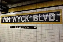 The station's original name was Van Wyck Boulevard. Van Wyck Boulevard was the name of the wide thoroughfare that existed when the station opened. The Van Wyck Expressway was built over the boulevard in the early 1950s. The name was changed to Briarwood–Van Wyck Boulevard in 1998[53] to avoid confusion with Jamaica–Van Wyck on the IND Archer Avenue Line.[54]