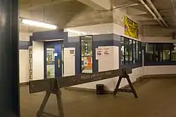 The station renovation was started in 2010 and was to be completed by 2016, with a new elevator entrance and rebuilt, widened mezzanine corridors.[37] However, delays abounded, including the fact that the new Main Street exit was delayed, having been pushed back from August 2012, to October 2013, and then again to March 2014; lead paint needed to be removed, costing $300,000; and plans were changed during construction, costing $1.7 million.[38] The opening of the new Main Street exit was subsequently pushed forward to February 2014, then back again to May 2014 with elevator work to begin after the new entrance opened; the elevator was to be complete by late 2014 or early 2015.[39] A new staircase entrance, on the northwest corner of Queens Boulevard and Main Street, was opened in December 2014.[40] In May 2017, officials opened the new elevator entrance, which is next to the staircase entrance that opened in December 2014. The elevator runs only between the street and mezzanine with no additional elevators or ramps to the platforms, so it is not ADA-accessible.[41]
