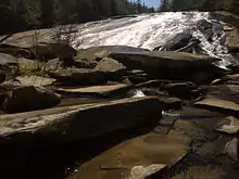 The waterfall begins as a slide which drops over a ledge approximately four feet high. The river then continues down a long, sloping, ever-steepening granite slope before plunging into some small pools or against large rock slabs at the bottom. A portion of the river drops off a 25' cascade on river left at the bottom.