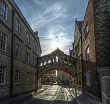 Hertford Bridge, often called "the Bridge of Sighs", is a skyway joining two parts of Hertford College over New College Lane in Oxford, England. Its distinctive design makes it a city landmark.