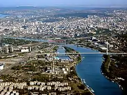 Ostružnica Bridge (Остружнички мост) is a three-lane semi-highway girder bridge carrying the Belgrade bypass. It was constructed from 1990 to 1998. The bridge was bombed by NATO during the Kosovo War in 1999 and fully reconstructed by 2004. The additional, parallel three-lane span is under construction since January 2016. The original deadline was 26 months, or April 2018. It was then moved to March 2019.[18] In May 2019 the end of construction was set to October 2019.[19] The twin bridge was officially opened on 14 June 2020.[20]