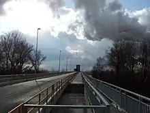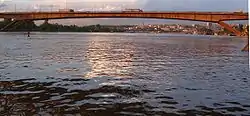 Gazela Bridge (Мост Газела) is the most important, central bridge in the city, the main connection between downtown Belgrade and New Belgrade, carrying the transit traffic on E70 and E75 highways. Daily traffic exceeds 165,000 vehicles.[16] It was built from 1966 to 1970. Immediately after the opening in 1970, a defect was noticed. Due to the miscalculations, the metallic construction began to depress in the middle of the bridge. By the 2010 reconstruction, it became visible both by watching the bridge from the side or crossing it. In order to alleviate the problem, on the metallic sections of the bridge, the concrete shoulders were replaced with the lighter, metallic ones. After a long debate, which lasted for years, on the condition of the bridge, a major reconstruction ensued in 2010-11.[16] After the reconstruction, city officials stated the bridge would be able to handle 200,000 vehicles daily for the next 40 years.[17] However, the bridge is still overloaded, despite the significant relief when the new Ada Bridge was opened for traffic on 1 January 2012. Additional relief is expected when the Belgrade bypass is completed.