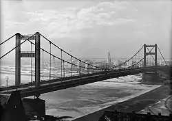 King Alexander Bridge (Мост краља Александра) was a road and tram bridge over the Sava. It was the first permanent road bridge across the Sava in Belgrade after almost 250 years and the Long Bridge from 1688.[3][4] Construction began in July 1930 and the bridge was modeled after the Mülheim Bridge over the Rhine, in Cologne, Germany. The third "twin", based on almost the same project was built in Vienna, Austria, crossing the Danube - the second incarnation of the Reichsbrücke which collapsed due to the structural failure on 1 August 1976. King Alexander Bridge was ceremonially open on 16 December 1934 with 700 horsemen crossing over it and on 5 November 1935 the first tram line over the bridge was established.[4][44] The bridge was demolished by the Yugoslav army on 11 April 1941 in order to prevent the advance of the German army.[3][4] Though unusable since April 1941, the remains of the bridge persisted until the heavy "Easter bombing" of Belgrade by the Allies on 16 April 1944 when it was demolished completely.[3] The construction of the bridge was patterned in the Serbo-Byzantine style, placed on two pylons made of reinforced concrete, while it was held by the steel cables.[3] It was praised for having both the important infrastructural and symbolicIvalue as it was the first road bridge spawning the Sava, ending its purpose as the border river and marking the directions in which the city will develop.[45] The bridge was revered while existed being described as "gorgeous" and "one of the most important object ever built in Belgrade".[4] Its pylons were later used for the modern Branko's Bridge in 1956.[14]