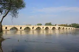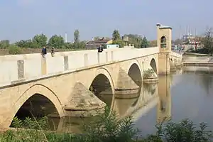 Edirne, which was the Turkish capital till 1453, is positioned on the main transit route linking Europe and Asia Minor.[1] Because the older part of city is positioned inside a large semi-circular loop in the Tundzha River, which at this point is wide but usually shallow, several stone arch bridges have been built to cross it to the north, west and south of the city. Starting from the north, and following the river's flow in an anti-clockwise direction, these bridges are as follows: