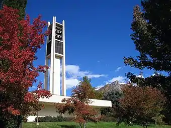 The BYU Centennial Carillon is a carillon on the campus of Brigham Young University (BYU) in Provo, Utah, US. The bell tower was erected in 1975 to commemorate the 100th anniversary of the school's founding. Built in a simple, modern style designed by architect Fred L. Markham, it is 97 feet tall and contains 52 bells. The bells range in size from 25 lbs to 4,730 lbs. The carillon tolls a tune based on the hymn "Come, Come, Ye Saints," followed by the hour, and tolls a chime on the half-hour. The hour and half-hour strikes are controlled by an automated system. Carillonneurs may also play the instrument by means of a keyboard located directly below the belfry, in a small room reached by a spiral staircase that ascends through the center of the tower.
