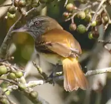 The bright-rumped attila is a common bird from the lowlands to 7,000 ft (2,100 m) ASL. It occurs in forests, second growth, pasture and plantations with trees, and shady gardens, and apparently it can tolerate a considerable amount of habitat destruction.[3] It is an active, aggressive and noisy species, usually seen alone. It eats insects, spiders, frogs and lizards taken from vegetation or the ground. It will pursue prey on foot as well as attacking in short sallies, and will follow army ant columns. It also takes many fruits (such as from gumbo-limbo Bursera simaruba, and less frequently from Cymbopetalum mayanum)[4] and seeds.