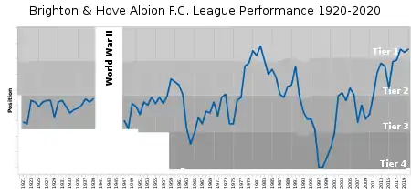By the late 1990s, Brighton was in the fourth tier of English football and were having financial difficulties. After narrowly avoiding relegation from the Football League to the Conference in 1997, a boardroom takeover saved the club from liquidation. Successive promotions in 2001 and 2002 brought Brighton back to the second tier, and in 2011, the club moved into the Falmer Stadium after 14 years without a permanent home ground. In the 2016–17 season, Brighton finished second in the EFL Championship and were thus promoted to the Premier League, ending a 34-year absence from the top flight.