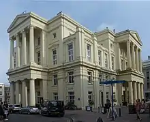 The foundation stone for the new building was laid by Thomas Read Kemp, a local property developer who had encouraged the initiative, in April 1830.[5] The new building, which was designed by Thomas Cooper in the Greek Revival style and built at a cost of £60,000, was officially opened in 1832.[1] The design included, on each side, a four-storey portico with a Doric order columns below and an Ionic order columns above, with a pediment on top.[1] The local police force, which was formed in 1838, established a police station in the building and police cells in the basement.[6] On 12 and 13 November 1858, the author Charles Dickens gave a reading of A Christmas Carol to a large audience at the town hall[7][8] and, on 16 September 1861, the opera singer Adelina Patti performed there during a concert given by the composer and pianist Wilhelm Kuhe.[9]