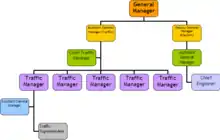 The transport department is overseen by a "Deputy General Manager (Traffic Operations)" who is assisted by the "Chief Manager (Traffic)." The 'Chief Manager (Traffic)' oversees the five BEST zones, each headed by a 'Dy. Chief Manager (traffic)'. Each zone consists of 7 to 8 depots, whose operations are overseen by an 'assistant general manager (Traffic Operation)'. A 'Depot Manager' or 'Dy. Depot Manager' heads each depot.[10]