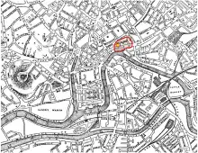 The castle was demolished in 1656, according to Millerd's map of Bristol (above right). However one octagonal tower survived until it was torn down in 1927. It was sketched by Samuel Loxton in 1907.[13] There are some remains of the banqueting hall incorporated in a building which still exists above ground today, known as the Castle Vaults. In 1938 the Castle Vaults was used as a tobacconists shop.[14]