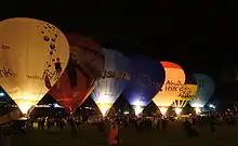 One popular attraction is the night glow, when balloons are inflated and glow to music after dark. These are held on the opening Thursday night at approx 9:30pm, followed by a spectacular fireworks display. There is another night glow at the same time followed by the fireworks on the Saturday night. Some people see these as the highlight of the fiesta.[2]