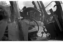 The blades of the three-bladed main rotor were attached to the rotor head with lightweight interleaving steel plates while tie-rods carried the centrifugal tension loads.[5] The blade levers were connected using ball joints to the arms of a control spider, the cone of which was actuated up and down by the collective pitch lever which changed the pitch of all the blades; an irreversible mechanism was used to prevent blade loads being transferred back to the control stick. The blades were supported when stationary or turning slowly by droop stops, which maintained a minimum clearance between the blade tips and the tailboom even in high winds; these stops were withdrawn above 100 RPM so that full freedom of movement for effective flight was possible.[7]
