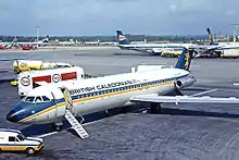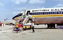 To support its ambitious expansion plans,[69] BCal acquired a number of additional, second-hand Boeing 707s from various sources through its aircraft trading and leasing subsidiaries during the early 1970s.[70][71][72] These included a pair of 320C series aircraft procured on a long-term lease from Britannia Airways featuring a two-class, "widebody look" interior. Another three 707s received re-modelled "widebody" cabins. All five were used to inaugurate the airline's transatlantic scheduled routes to New York and Los Angeles where the established competition was operating widebodied aircraft, such as the Boeing 747 "jumbo jet". It was thought that the aircraft's widebody style interiors would leave passengers with the impression that BCal was operating widebodied aircraft when in fact it was not.[1][2][39][66][73][74][75][76][77][78] During that time, BCal placed an order with the British Aircraft Corporation (BAC) for two new One-Eleven 500s and acquired additional second-hand examples.[79] At the same time, the airline disposed of some of its 707s,[33][70][72] VC10s[33][70] and One-Eleven 200s.[70][79] These included the original pair of 399C series 707 aircraft that had been delivered to Caledonian Airways direct from the manufacturer in 1967/68.[72]